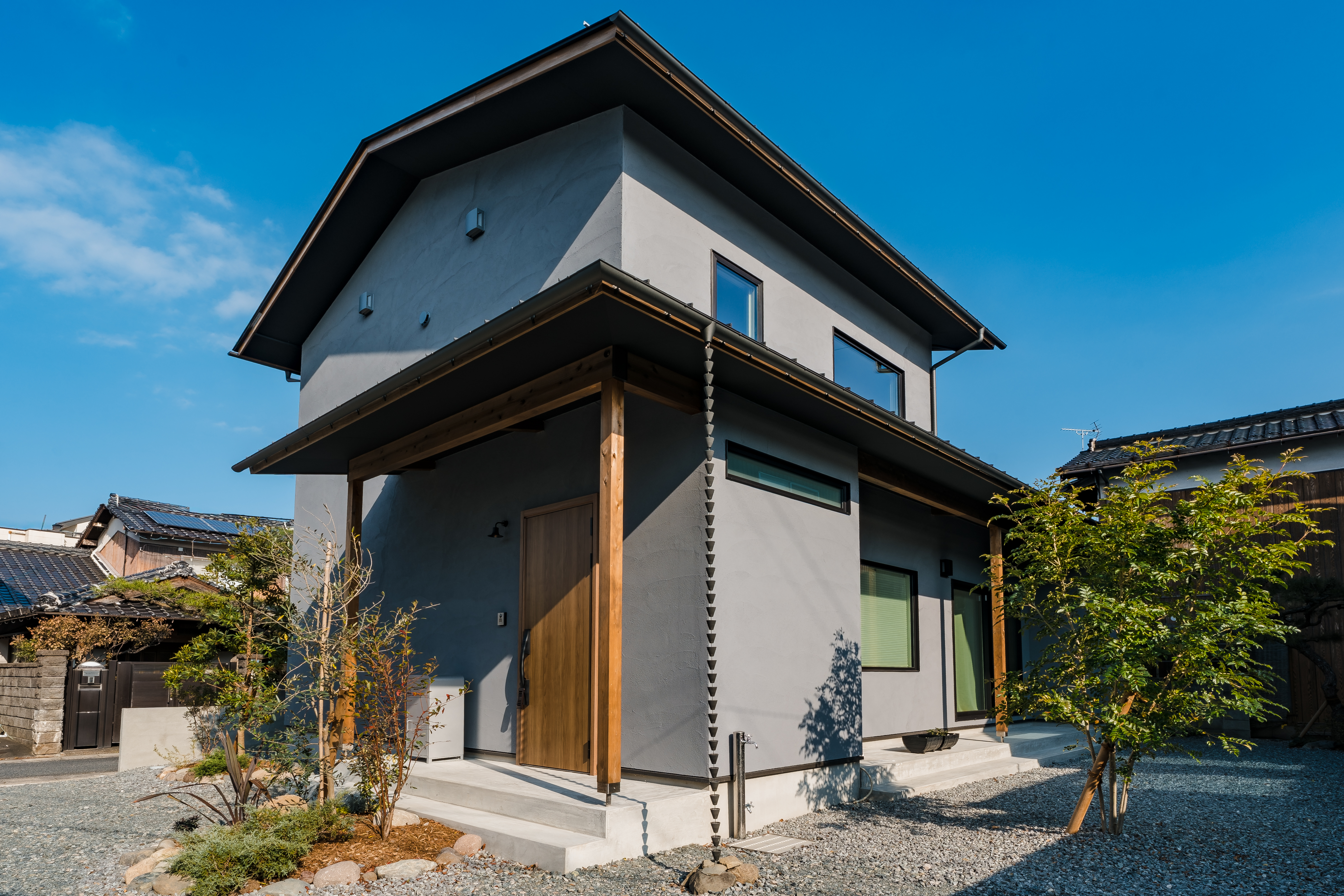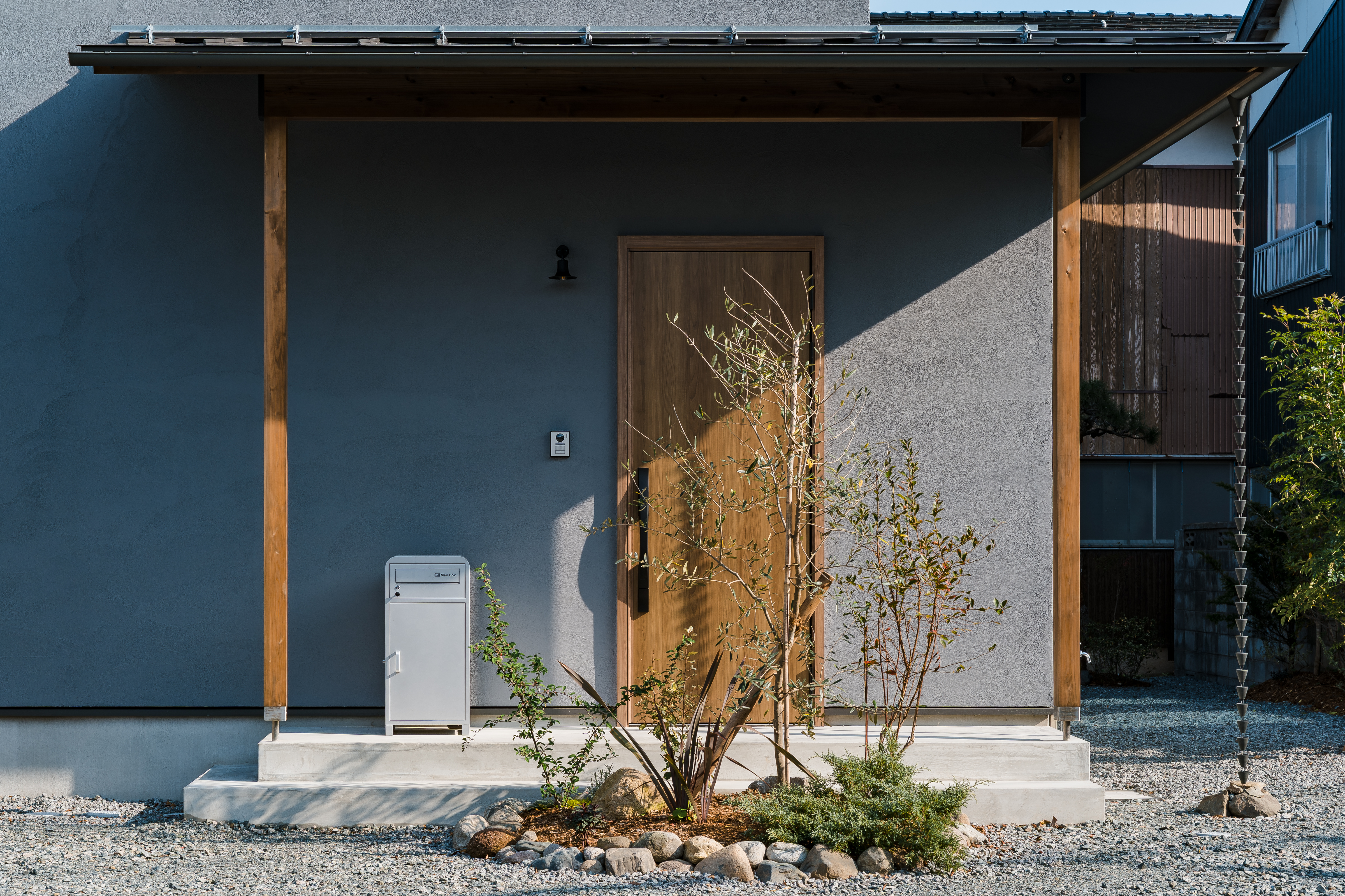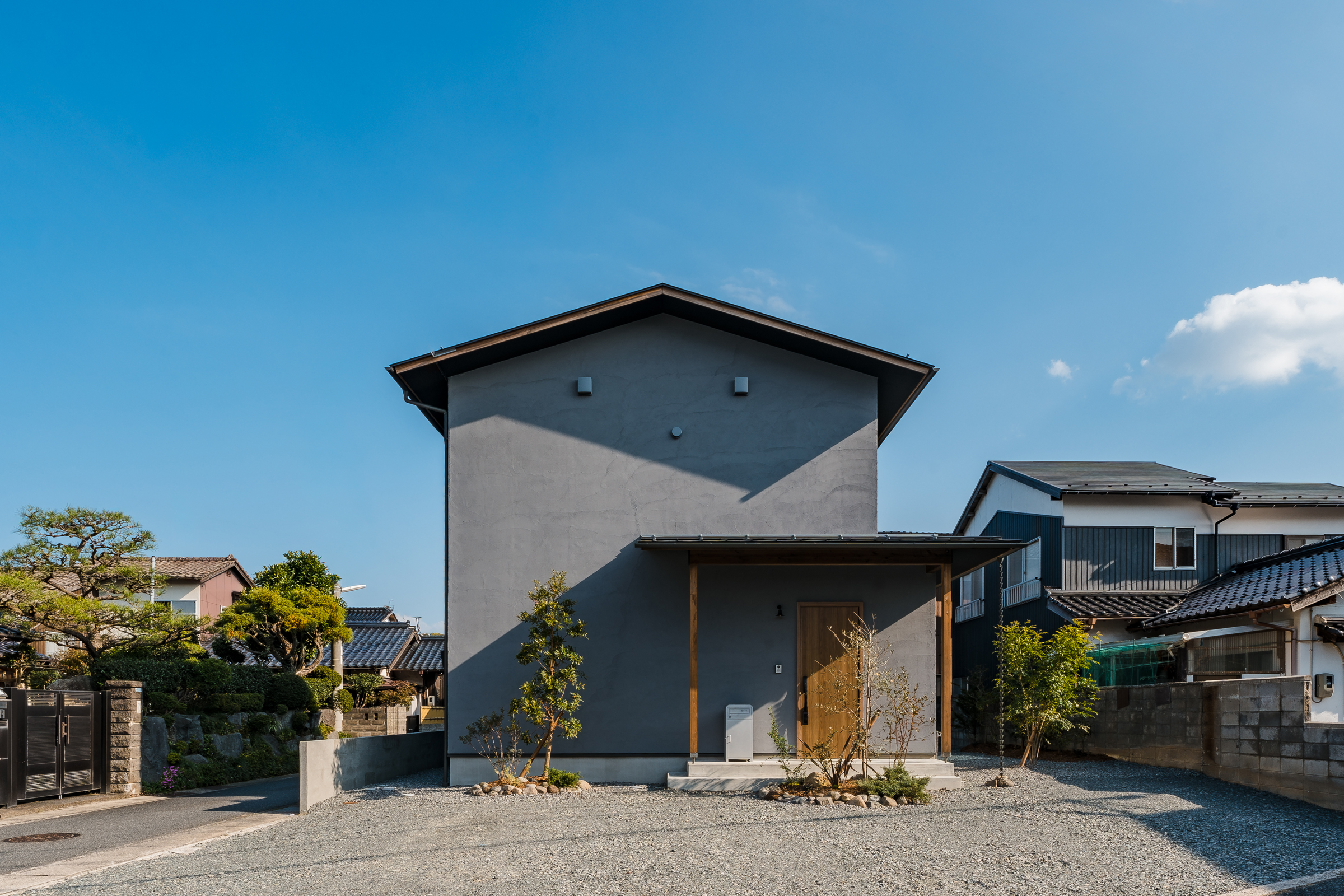 外観は濃いグレーの左官仕上げとし、あえてコテのムラを残すラフな塗り方を採用しました。光の当たり具合によって陰影が生まれ、職人の手仕事が感じられる外壁となっています。