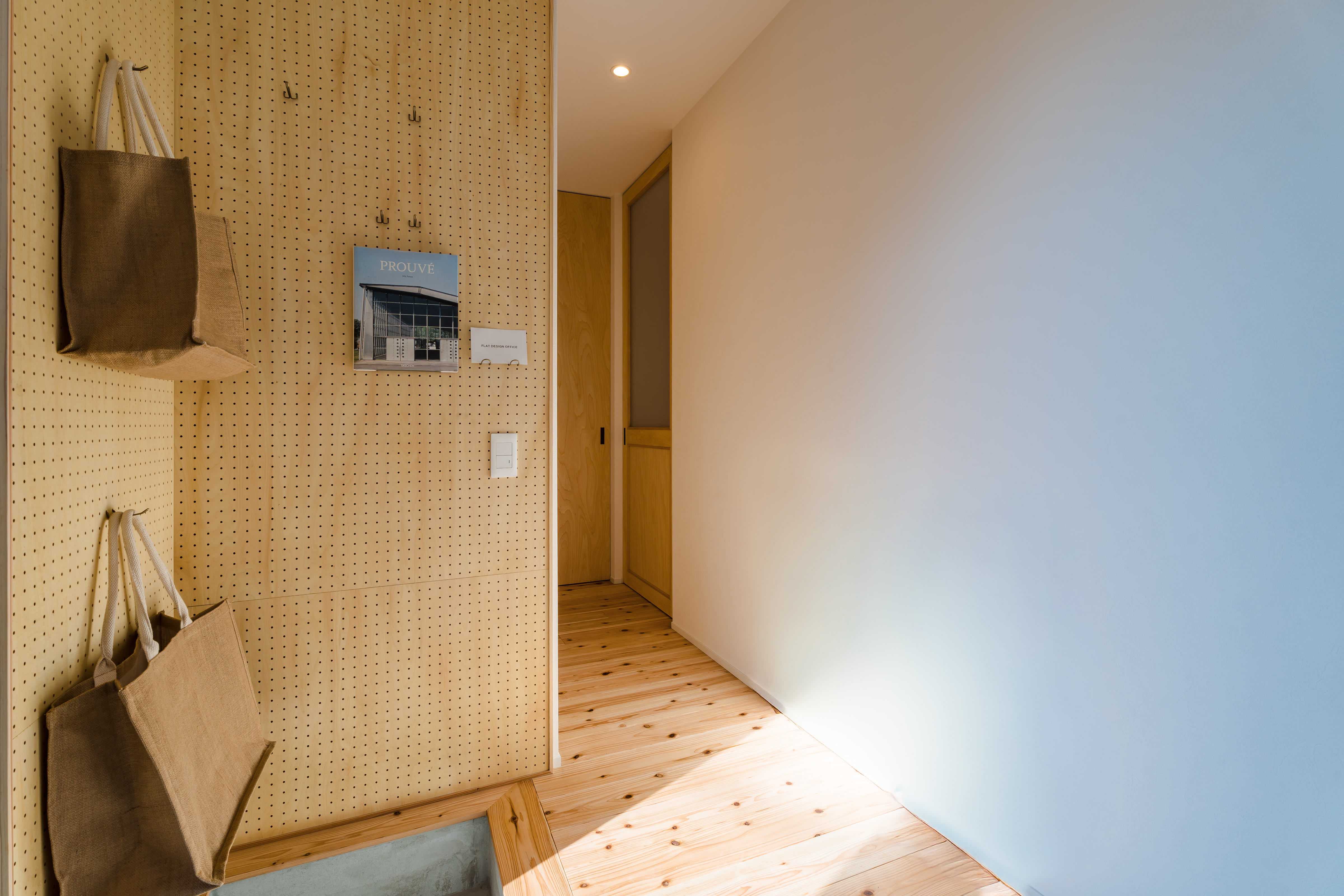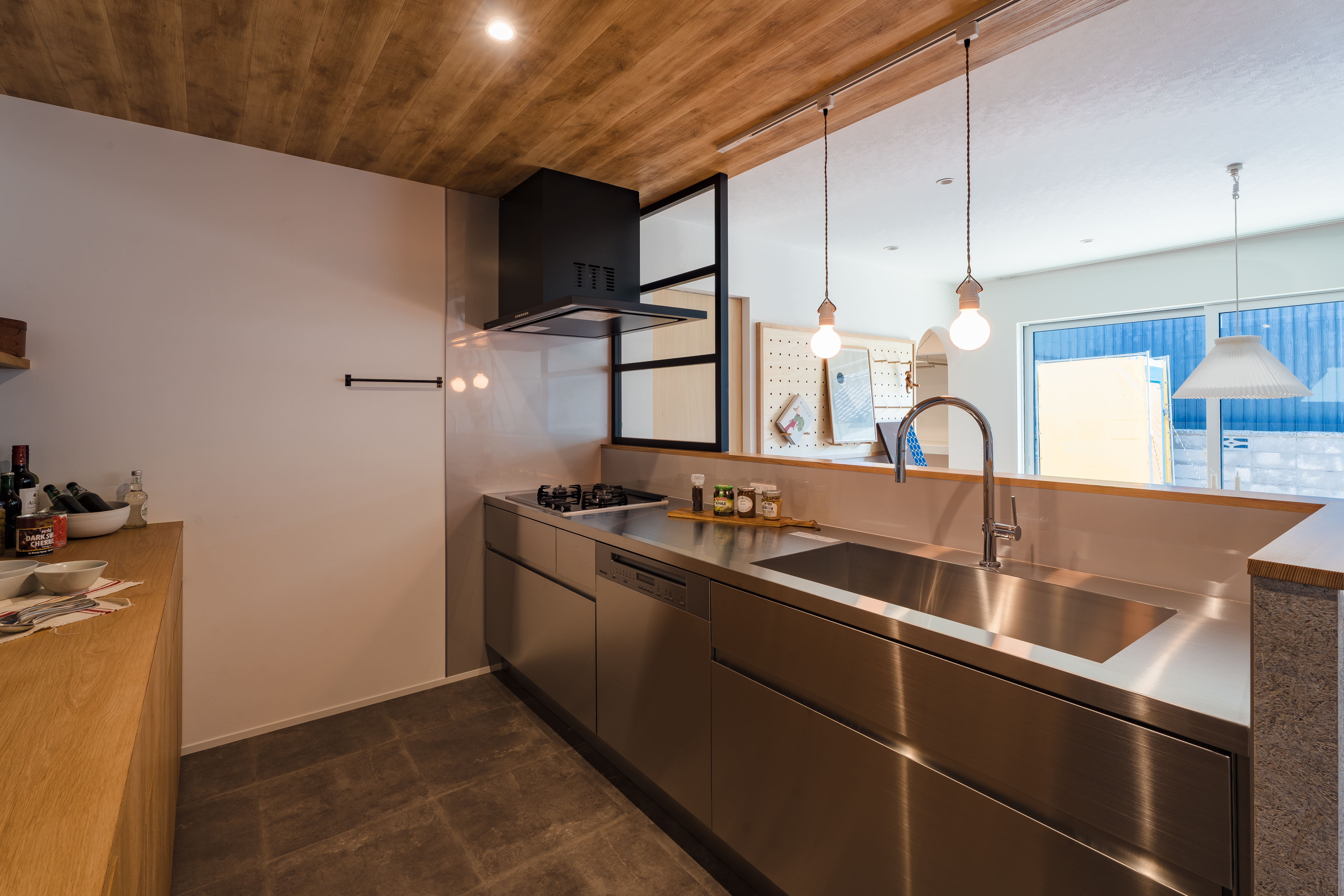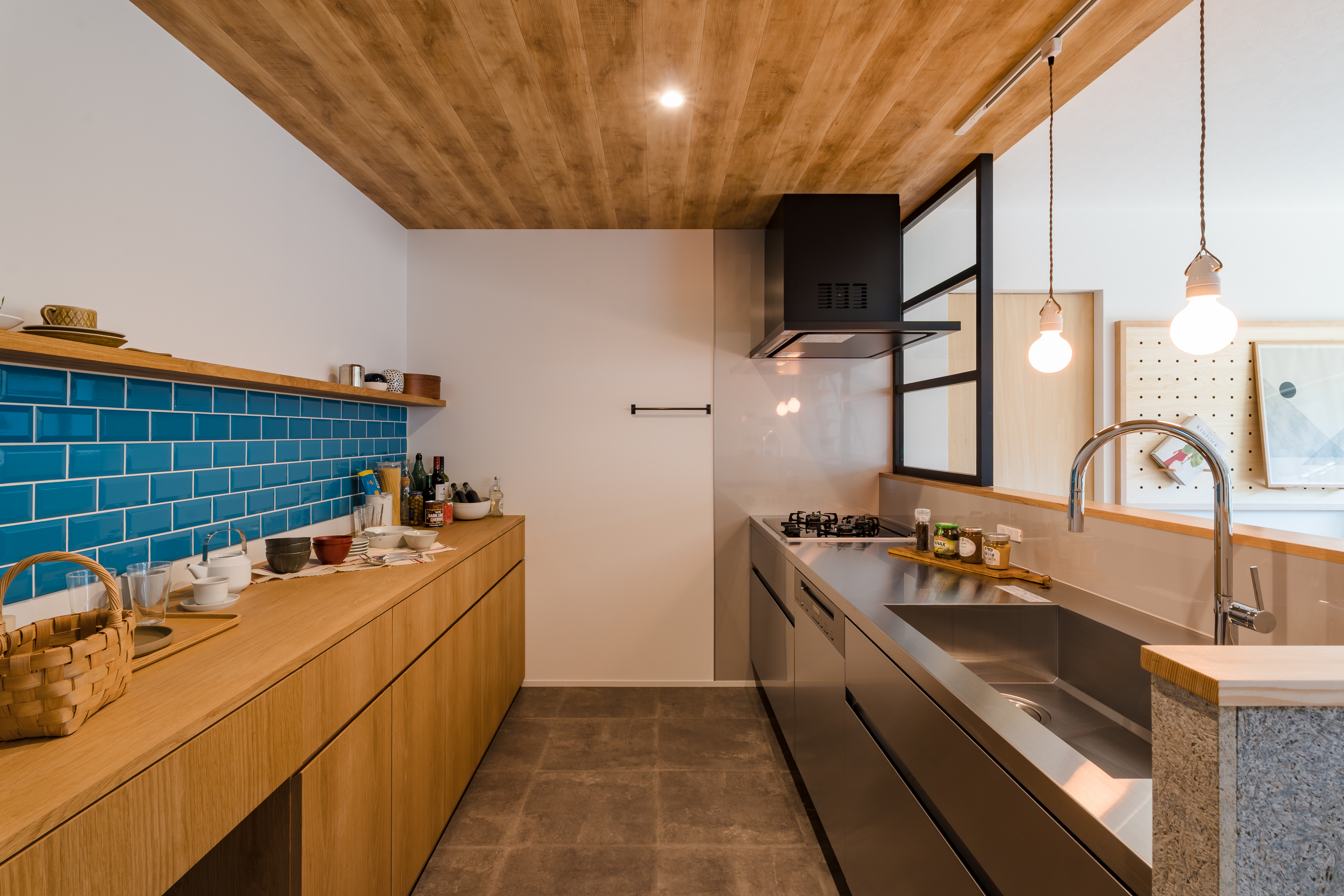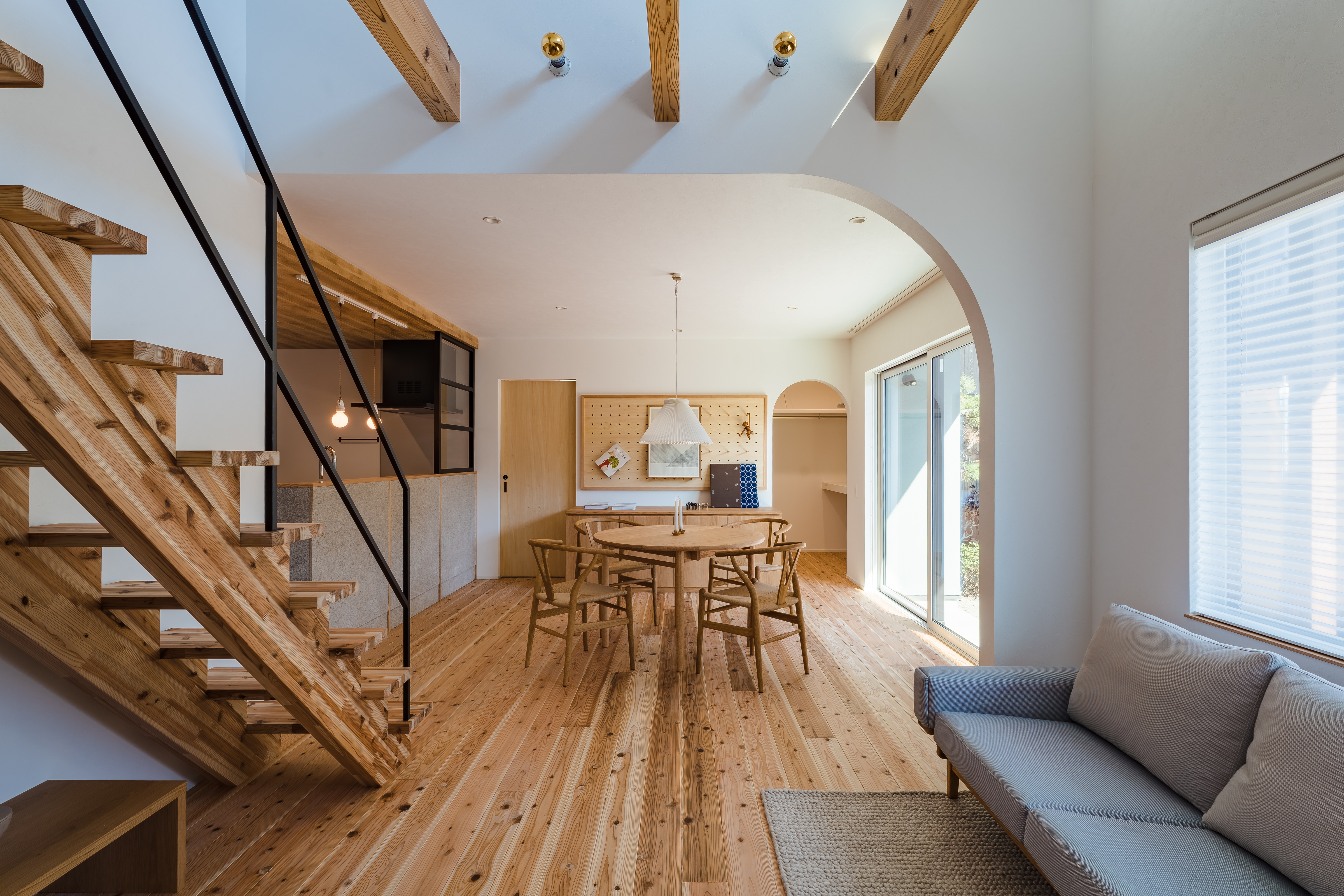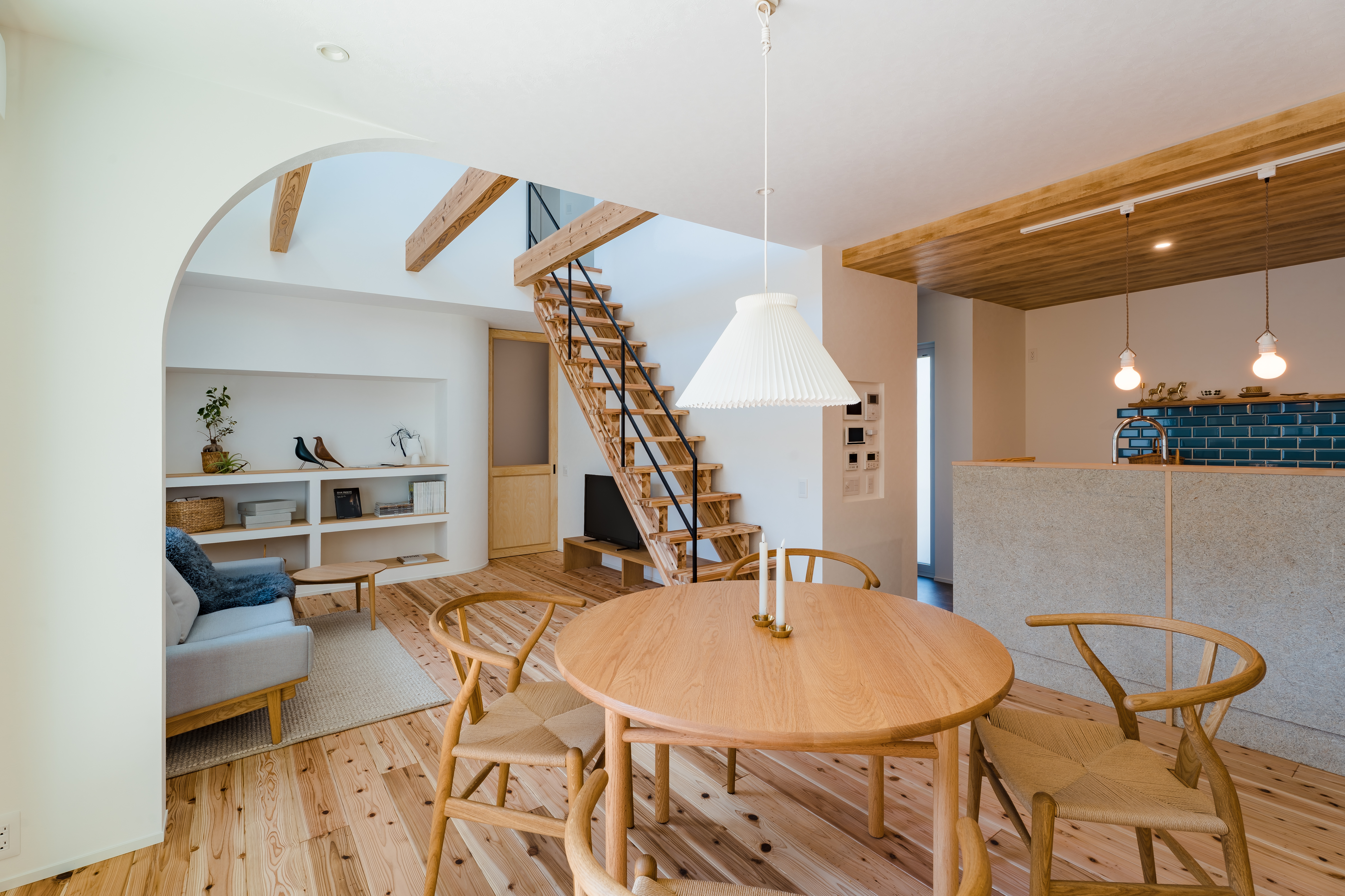 また、高気密・高断熱仕様に加え第一種換気を採用しているため、年間を通して快適に過ごせます。アールの開口や造作棚、オリジナルの有孔ボード、タイル貼りの壁面など、ご家族の遊び心が随所に見られる、とても素敵なお住まいとなりました。