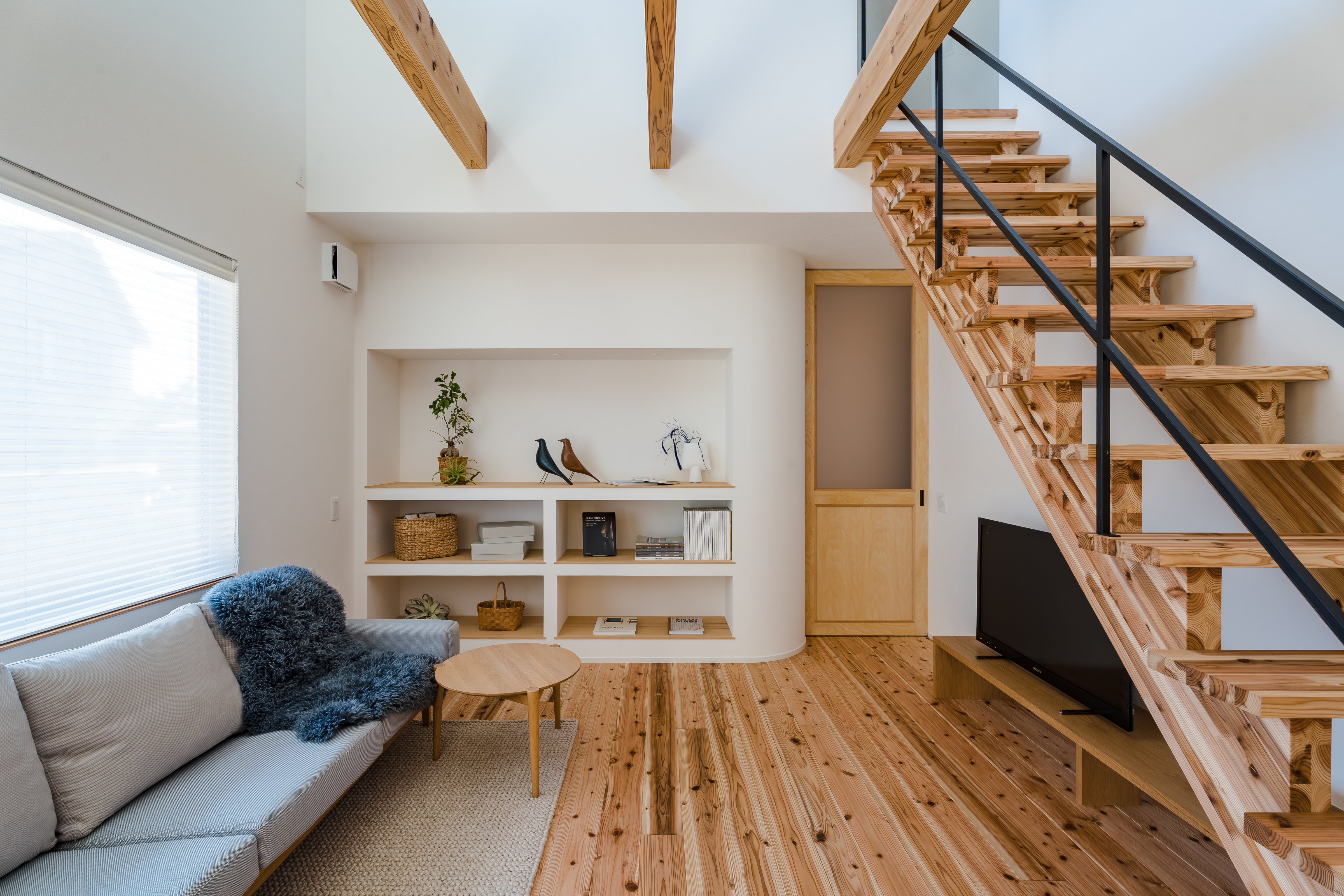 室内は、床と階段に杉材を使用し、吹抜けの梁も構造材を意匠として見せることで、木の質感や温もりをダイレクトに感じられるナチュラルなインテリアに仕上げました。