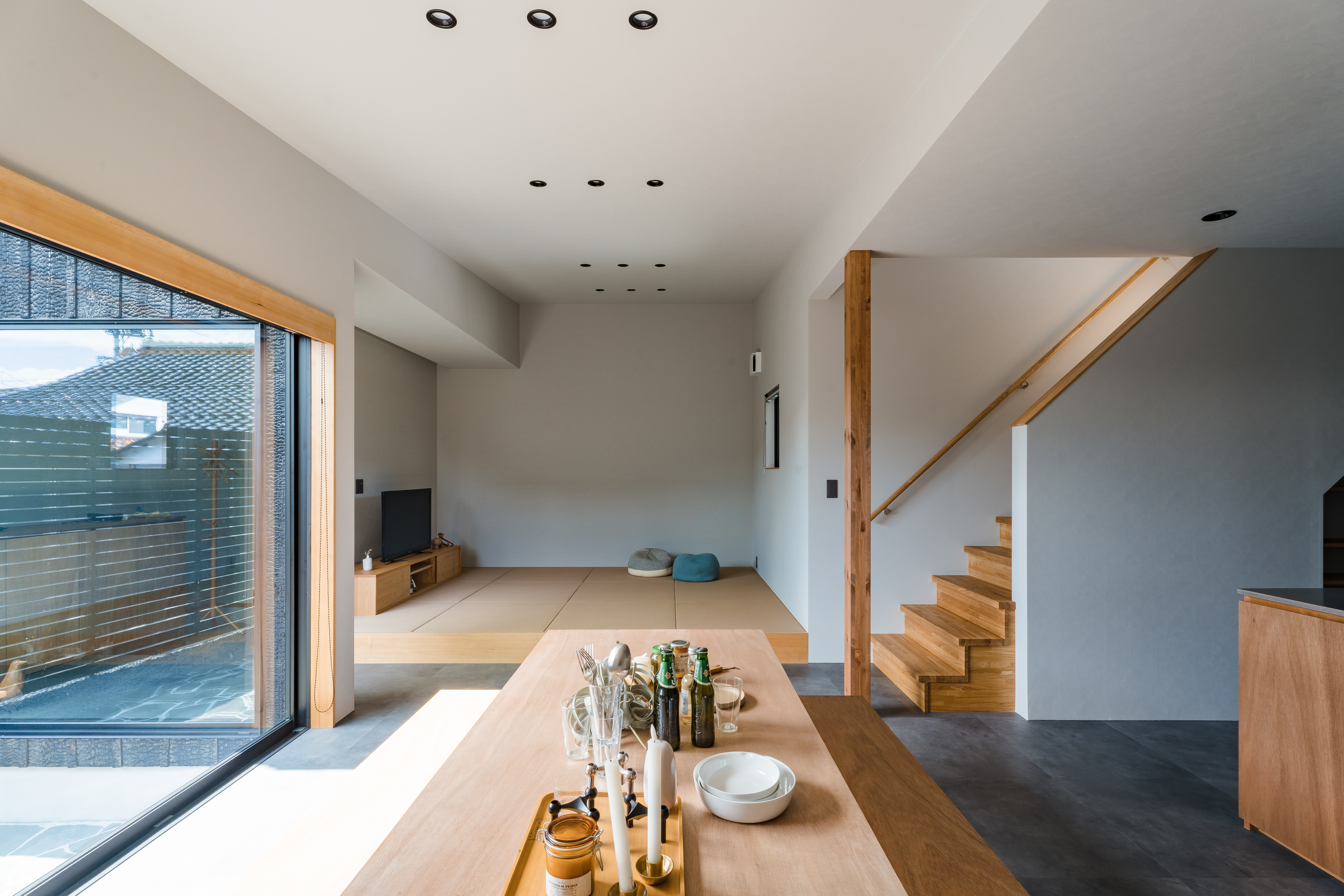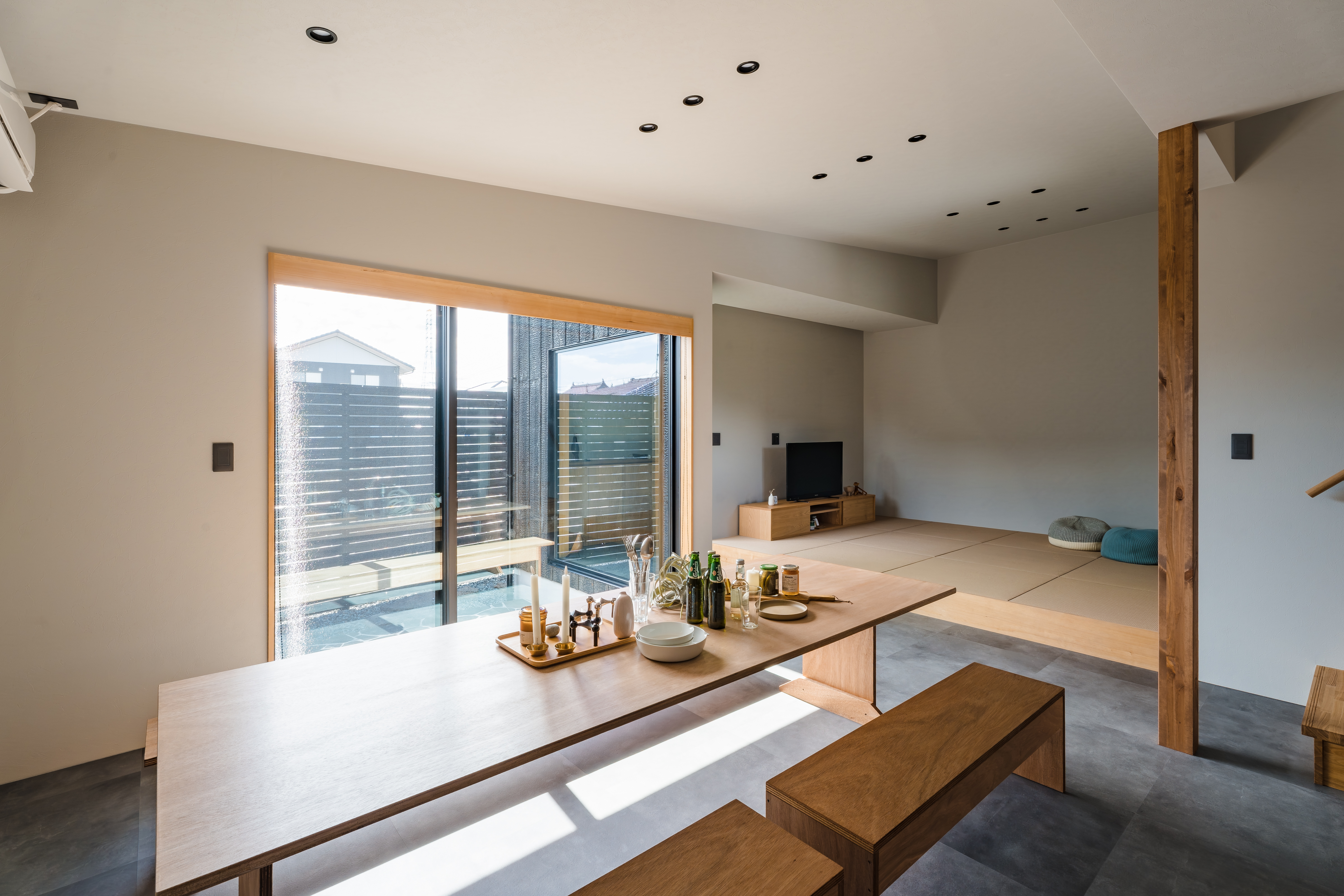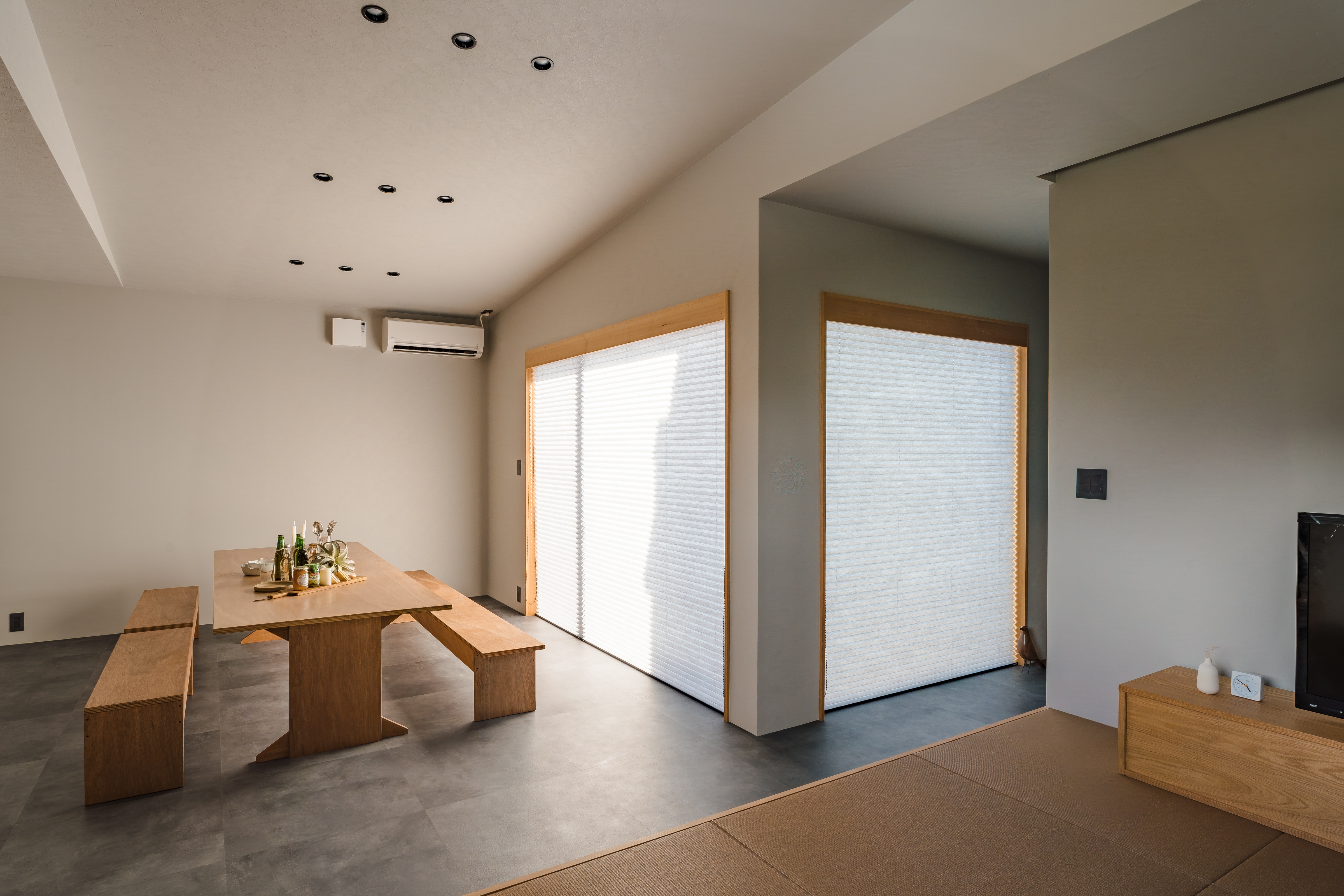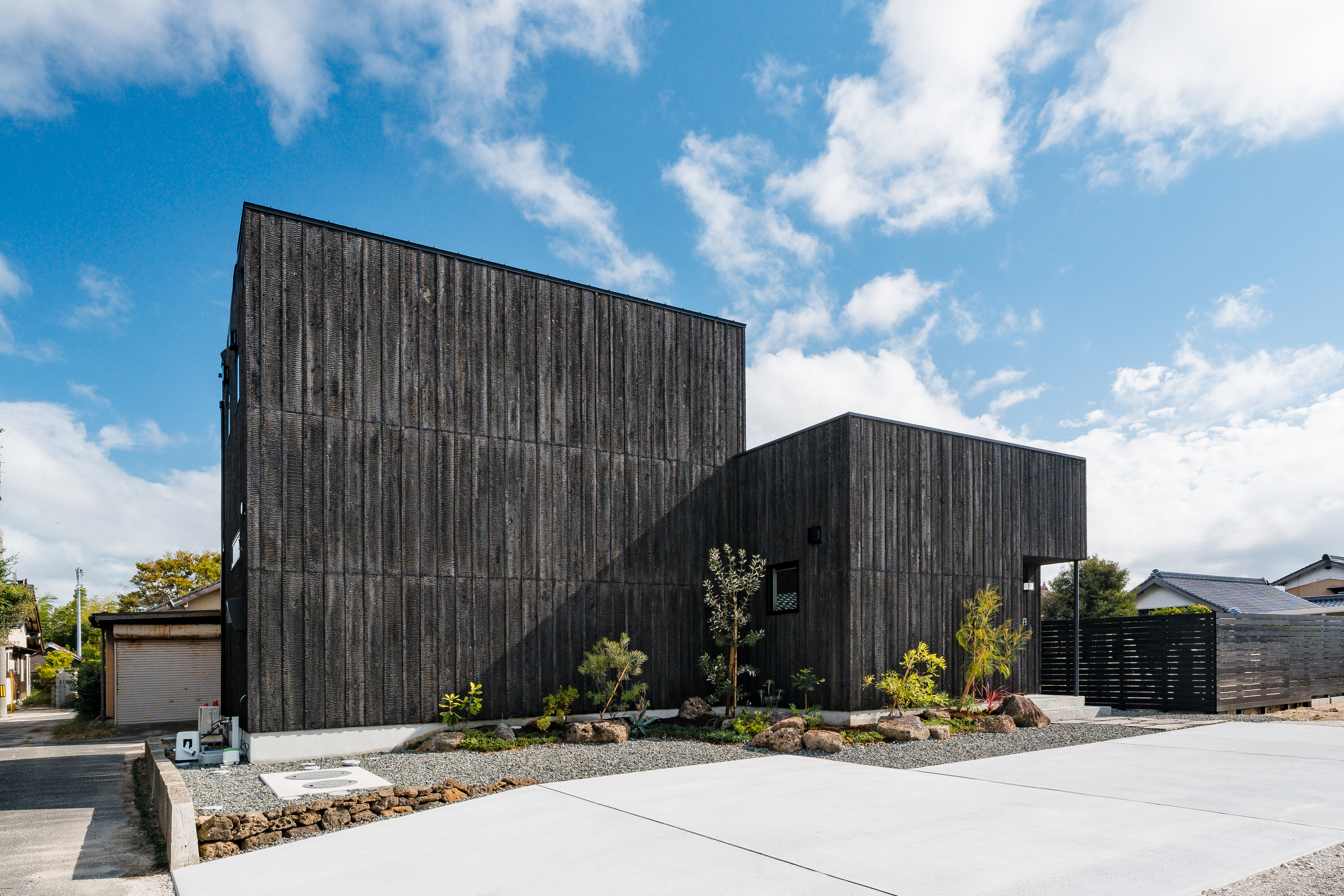 CONCEPT 道路沿いの住宅街に位置する土地での計画です。 正面の外観は窓を設けず、黒一色で統一しました。 南側には、ご要望であったBBQを楽しめる中庭を配置しました。外部からの視線を遮ることで、開放感とプライバシーを両立した心地よい屋外空間となっています。 内装はグレーを基調にトーンを抑え、落ち着きのある雰囲気に仕上げました。小上がりの畳リビングや玄関の洗い出し仕上げなど、随所に和の要素を取り入れています。素材はコスト面にも配慮しつつ、質感や雰囲気を大切に選定し、シンプルながらも豊かな空間を実現しました。 |