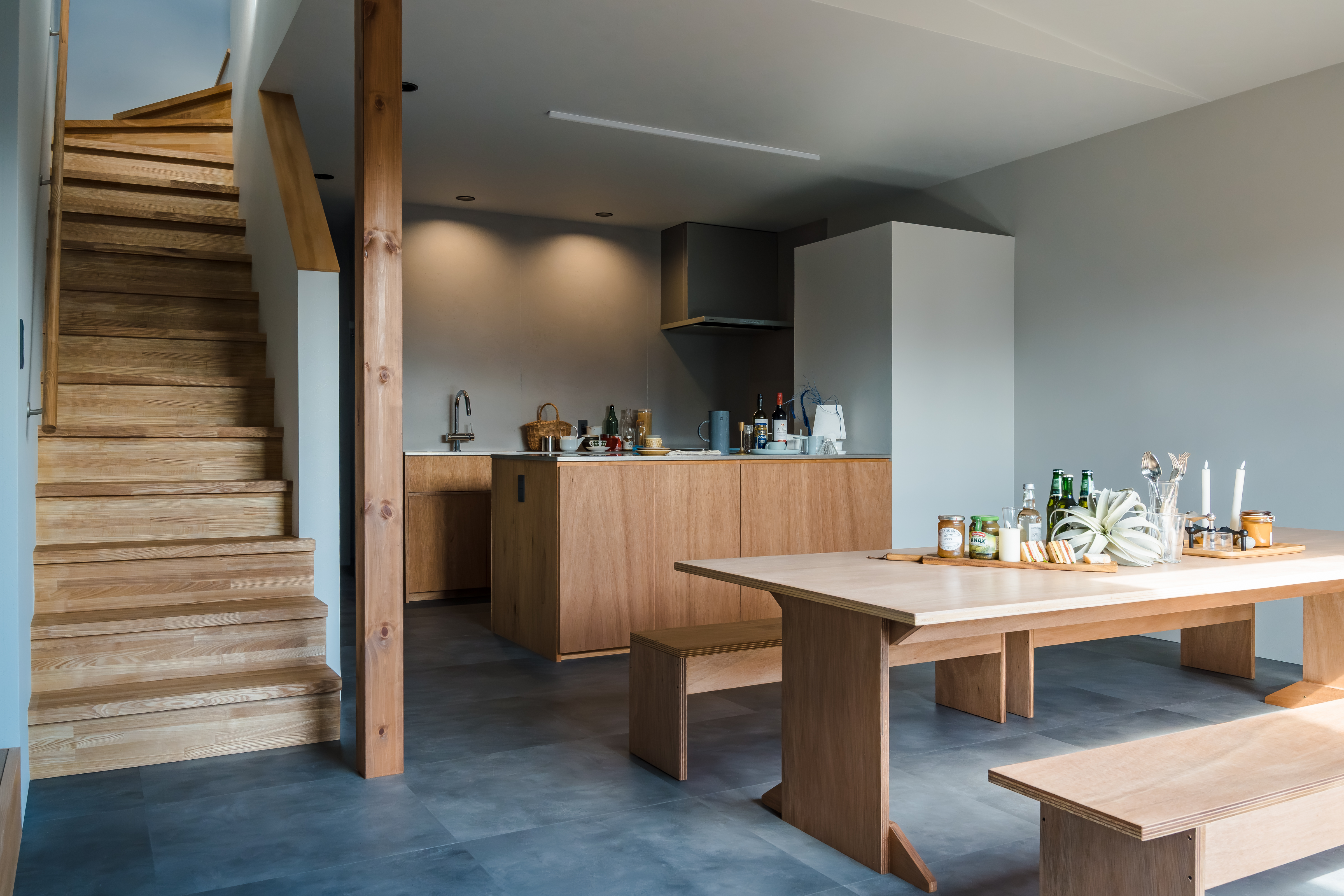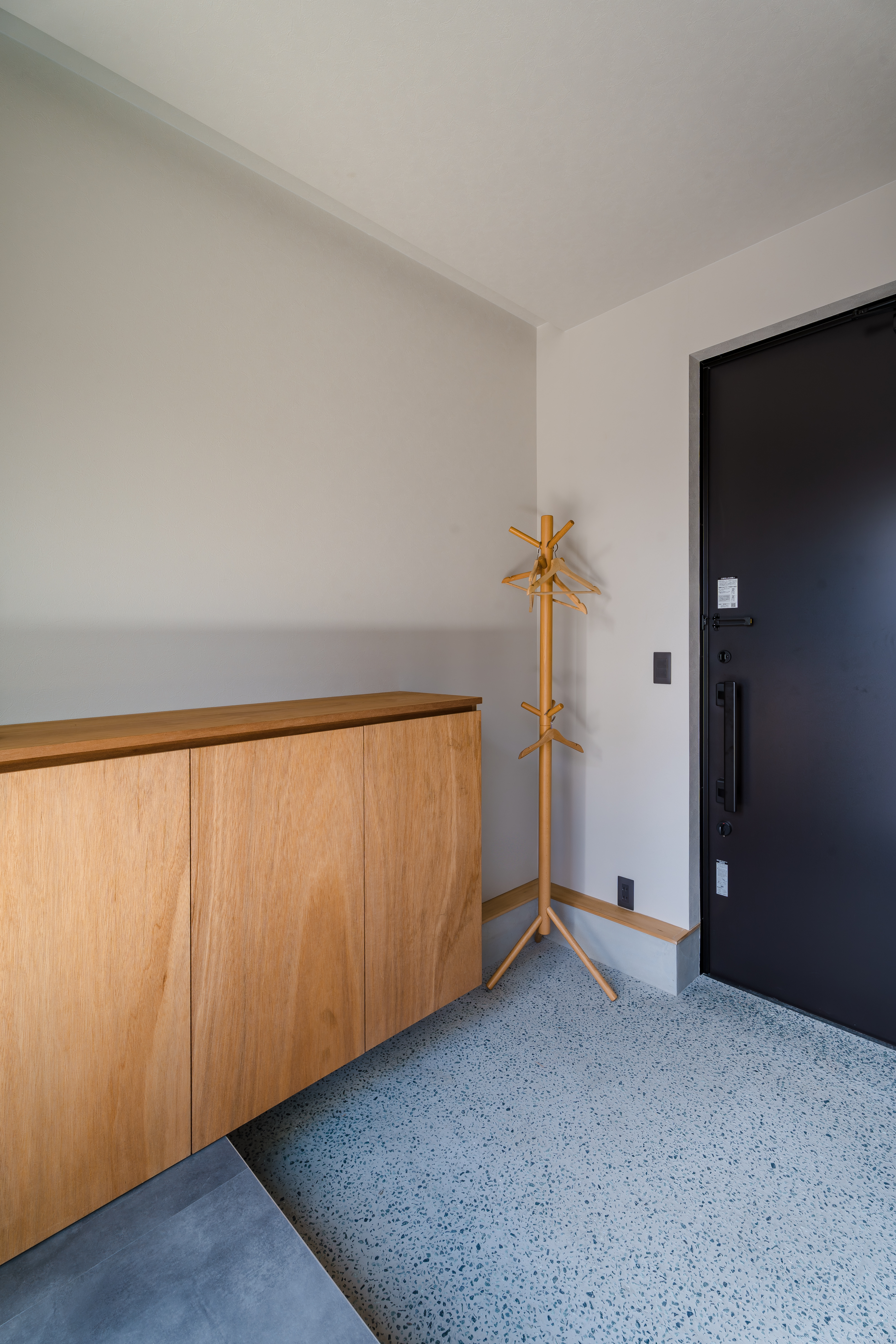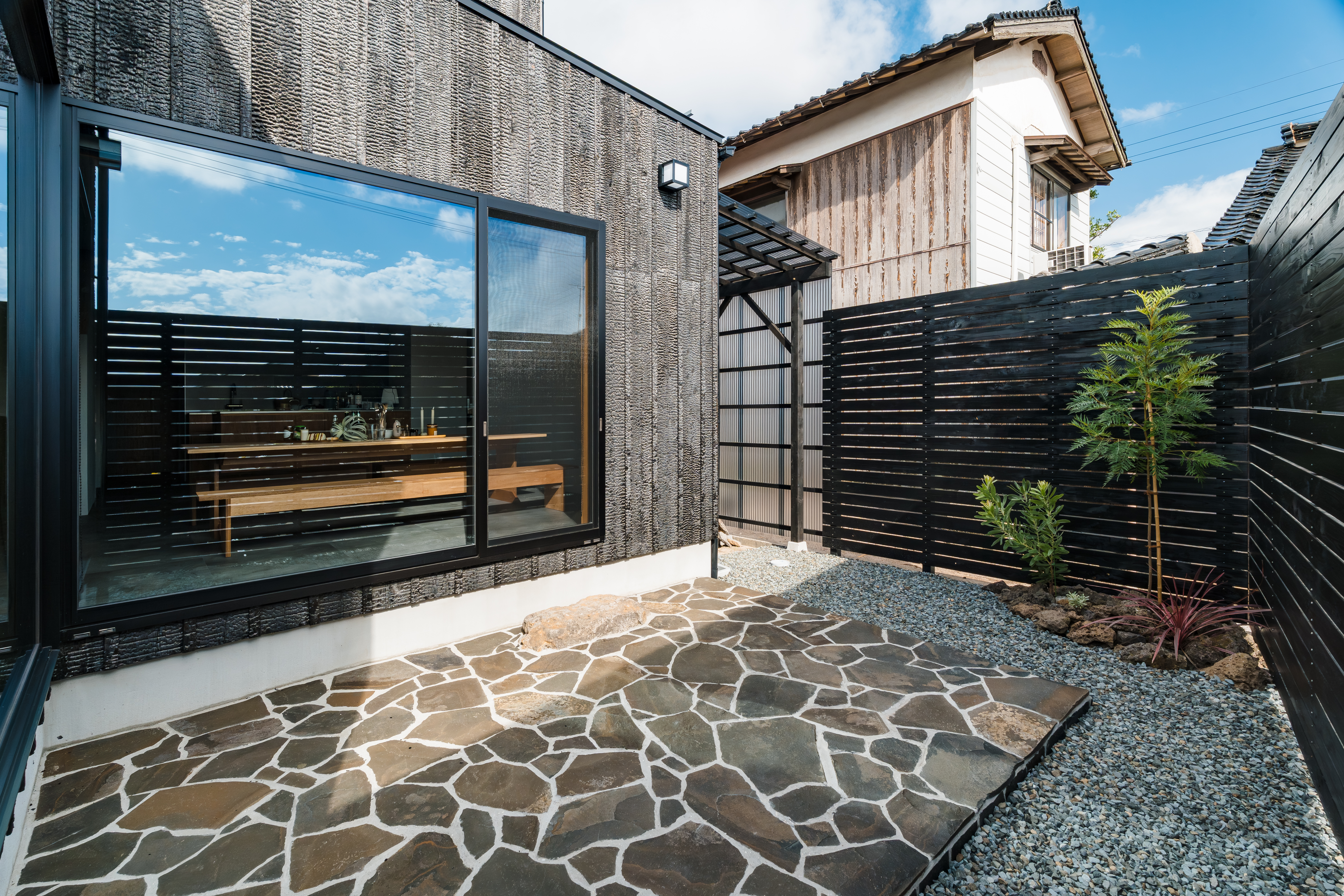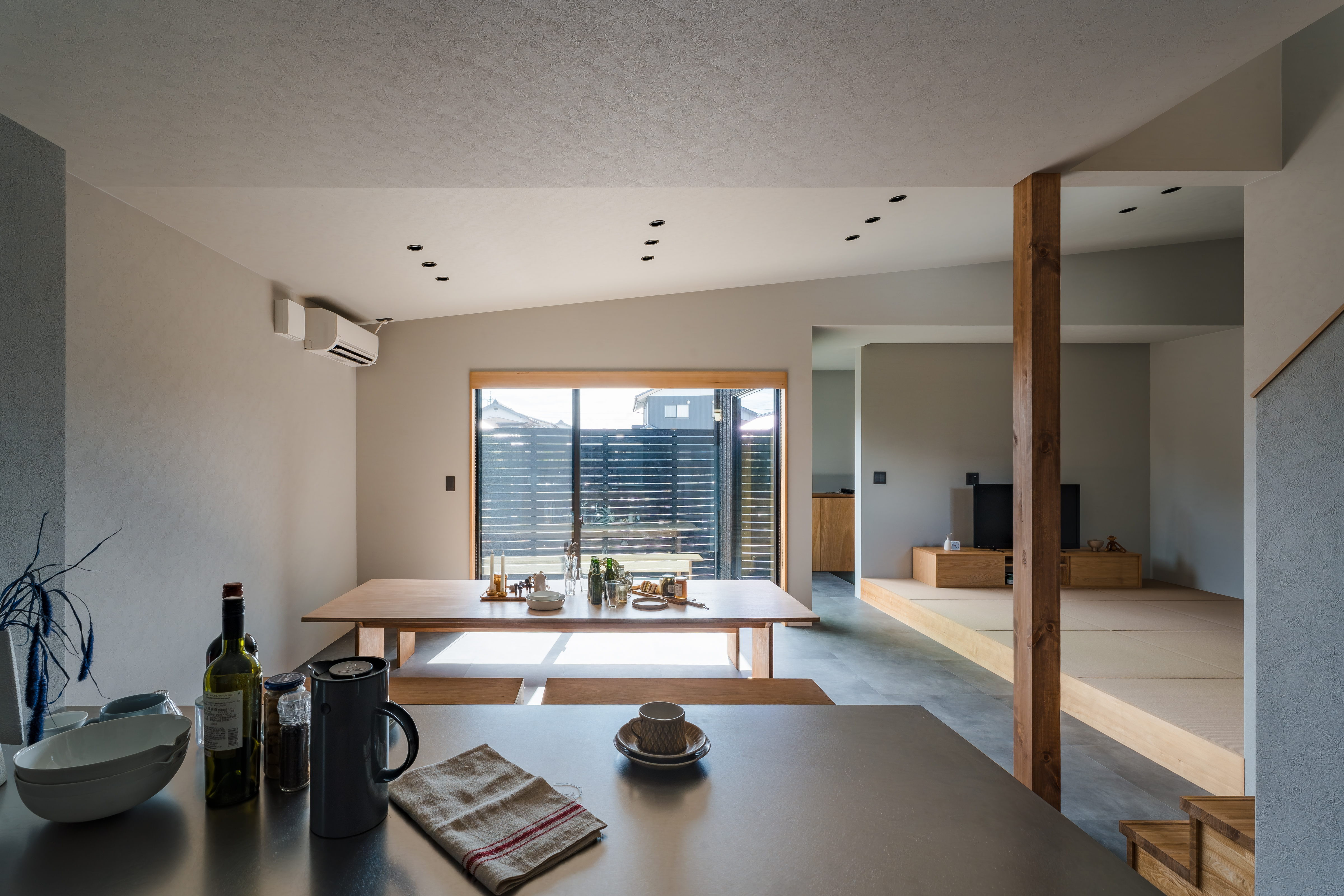 CONCEPT 道路沿いの住宅街に位置する土地での計画です。 正面の外観は窓を設けず、黒一色で統一しました。 南側には、ご要望であったBBQを楽しめる中庭を配置しました。外部からの視線を遮ることで、開放感とプライバシーを両立した心地よい屋外空間となっています。 内装はグレーを基調にトーンを抑え、落ち着きのある雰囲気に仕上げました。小上がりの畳リビングや玄関の洗い出し仕上げなど、随所に和の要素を取り入れています。素材はコスト面にも配慮しつつ、質感や雰囲気を大切に選定し、シンプルながらも豊かな空間を実現しました。 |